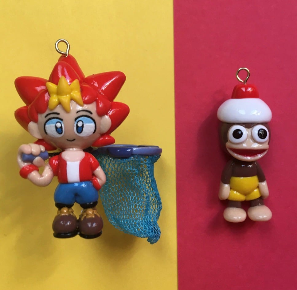 Polymer Clay, Acrylic paint, gold-colored headpins, fabric net, DuraClear Gloss varnish