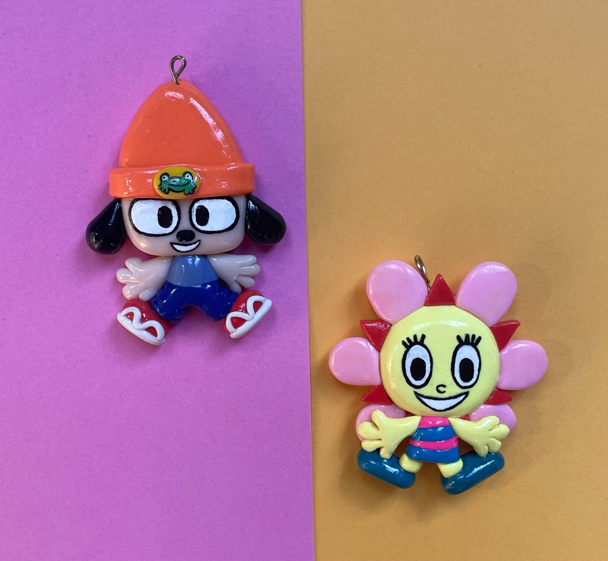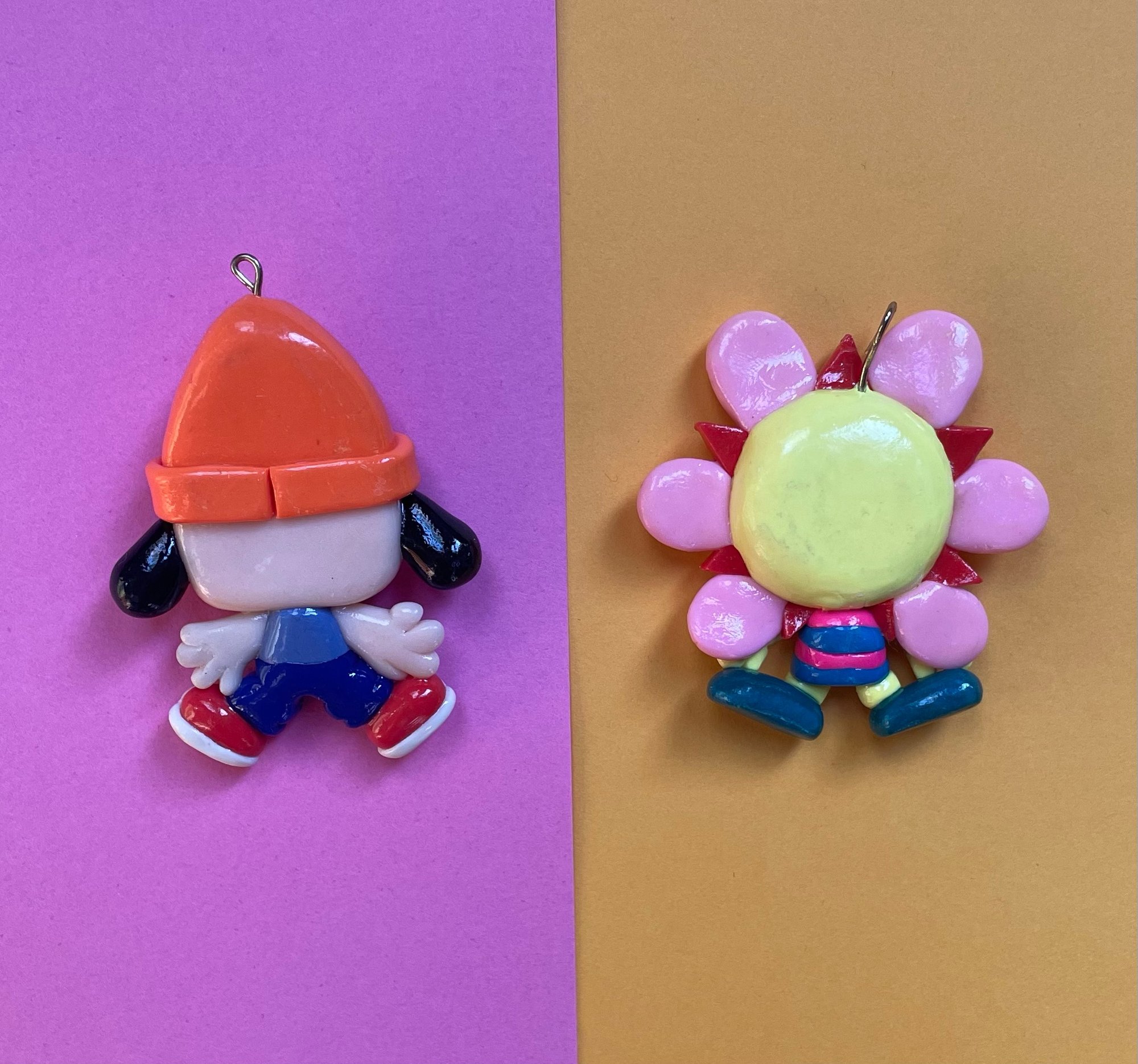 Polymer Clay, Acrylic paint, gold-colored headpins, DuraClear Gloss varnish